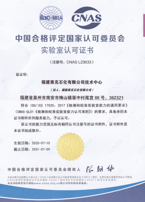 实力认证!福建莱克石化技术中心获CNAS实验室认可证书!